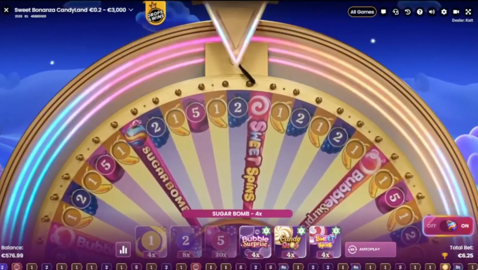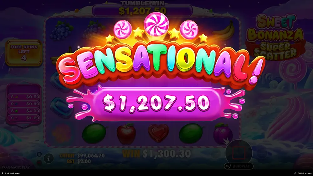 Cuando aparecen cuatro o más símbolos scatter (piruletas), los jugadores reciben 10 giros gratis con multiplicadores que van desde 2x hasta 100x. Se otorgan giros gratis adicionales cuando aparecen tres o más símbolos scatter.